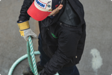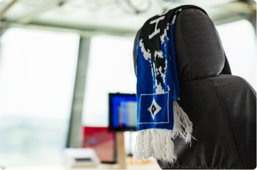 Das Erste, was Rune in seinem Steuerhaus in Betrieb nimmt, ist die Musikanlage. Musik muss immer laufen, sagt er. Was auch nicht fehlen darf: der HSV Schal. Der ist zu jedem Spiel natürlich mit an Bord. Wenn ihm dann noch eins der großen Schiffe zugeteilt wird, ist der Tag für Rune perfekt.