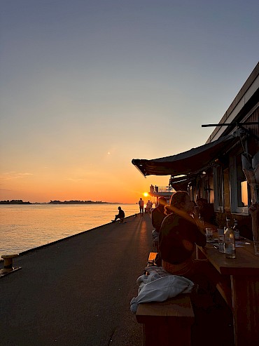 Ein Sauvignon Blanc auf dem Ponton? Oder lieber 'n Bier auf'm Pier? Kaum den Fuß von der Fähre gesetzt, eröffnet sich ein besonderer Logenplatz zum Pott-Watching. Auf dem Fähranleger Blankenese fühlt es sich an, als säße man direkt auf dem Wasser – landseitig der Elbstrand und das Treppenviertel, wasserseitig der weite Blick über den Fluss. Der FischClub serviert fangfrische Köstlichkeiten, und Ponton op’n Bulln wartet mit norddeutschen Klassikern auf. Den Soundtrack liefern die Bugwellen der Containerriesen, die schwipp, schwapp gegen den Anleger plätschern.